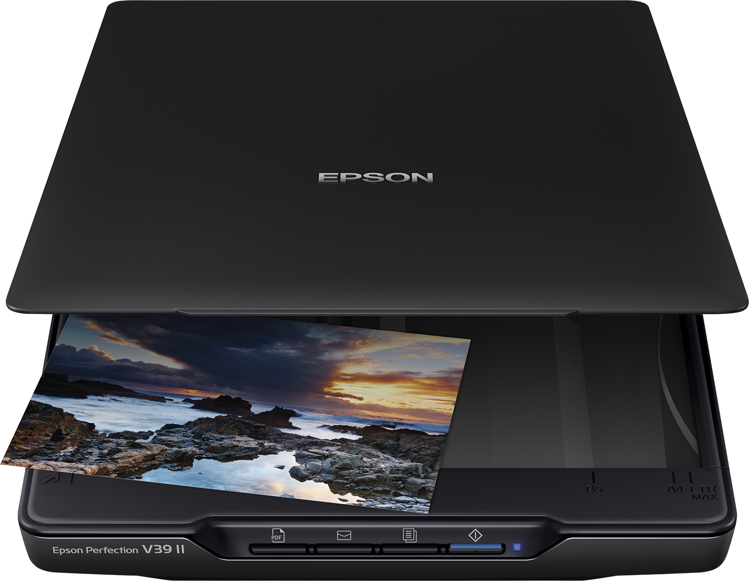 Denna lättanvända, USB-drivna skanner har en ny, smidig och utrymmesbesparande design. En integrerad hållare ger ytterligare flexibilitet eftersom skannern då kan användas såväl stående som på sidan, detta för att spara utrymme på skrivbordet. Med sina 4800 dpi och snabba skanningshastigheter ger V39II dig högkvalitativa resultat snabbt. Skannern är tillverkad av 30 % återvunnen plast, vilket minskar miljöpåverkan.